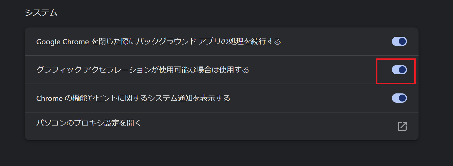 3. 「グラフィック アクセラレーションが使用可能な場合は使用する(または『ハードウェア アクセラレーションが使用可能な場合は使用する』)」という項目のスイッチをクリックして「オフ(灰色)」にします。