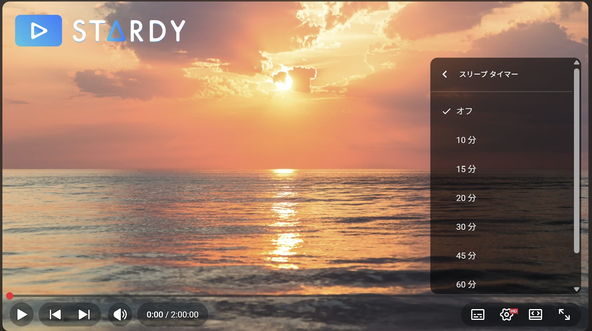 「スリープタイマーがセットされました」という通知が出れば設定完了です。指定した時間が経過すると、動画が静かにフェードアウトして一時停止します。